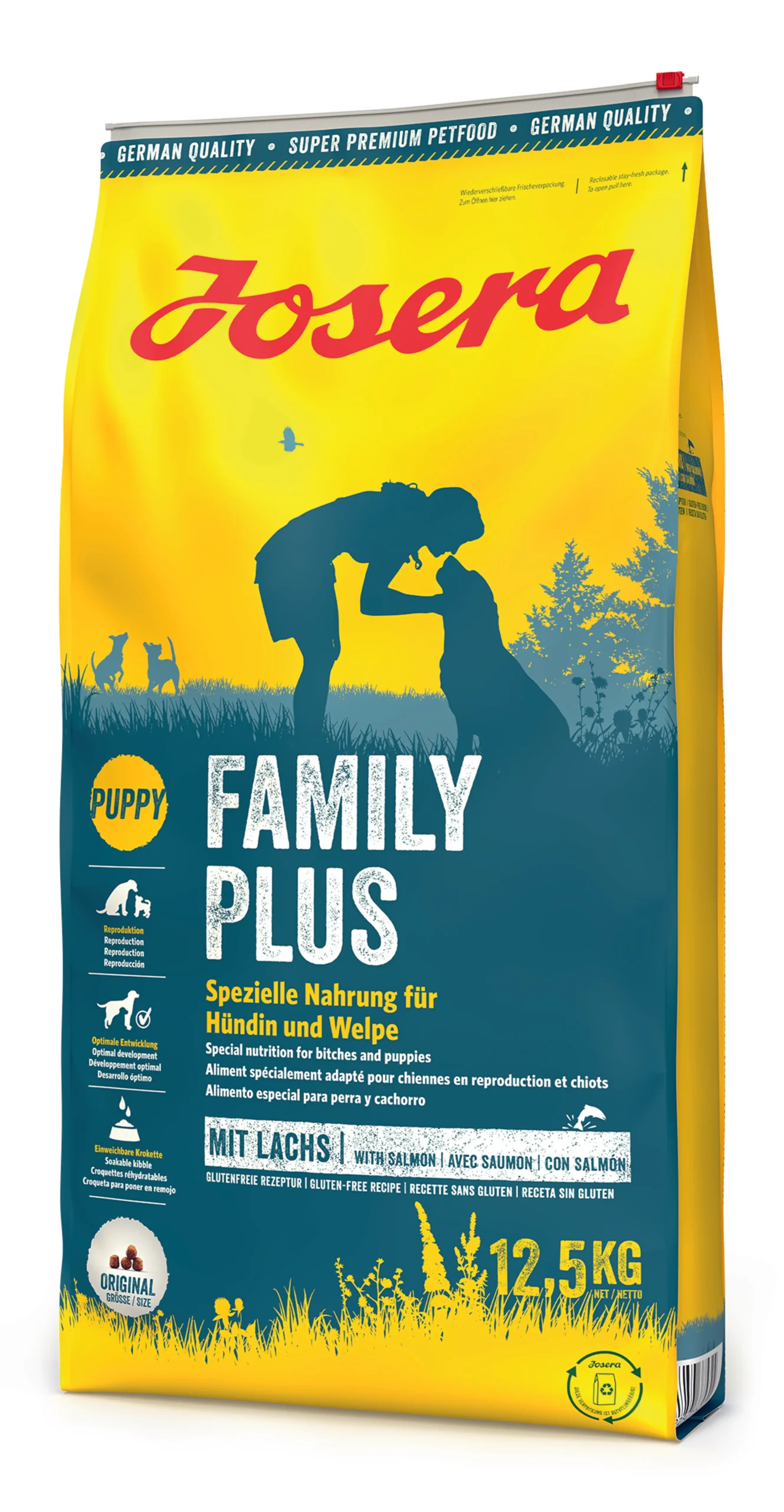 Tasty food for our mothers-to-be and puppies: The special formula not only covers a bitch‘s special requirement from the last trimester of pregnancy until the end of the nursing period. It also supplies unborn puppies with all the necessary nutrients and continues to do so during the nursing period. After this, nutritious kibbles can be softened in JOSERA puppy milk or water to help wean the puppies onto solid food.