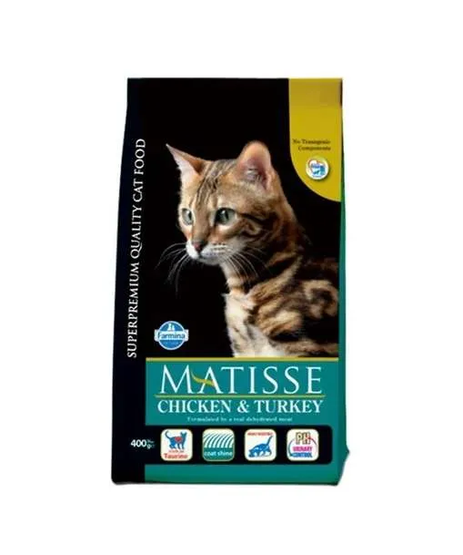 The Farmina Adult Cat Matisse Chicken & Turkey is a premium dry food crafted to meet the specific nutritional needs of adult cats. With a unique combination of high-quality chicken and turkey, this formula delivers an irresistible taste while ensuring your cat receives the essential nutrients for a healthy and active life.